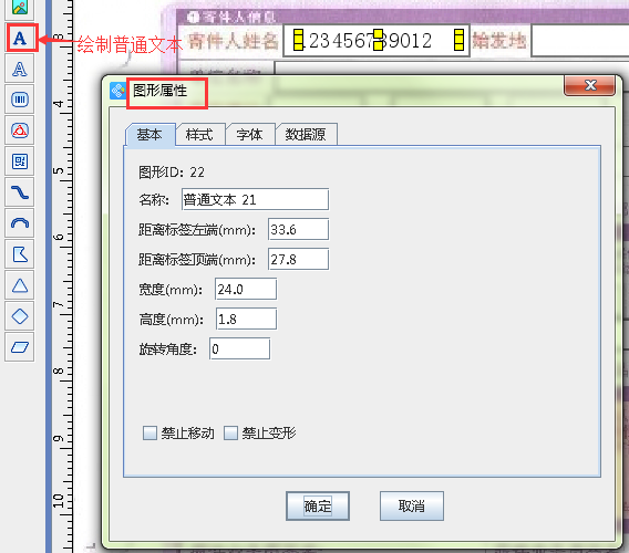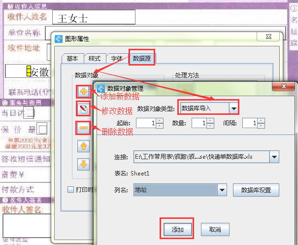 4.2在收件人姓名后面繪制一個(gè)普通文本,雙擊普通文本,出現(xiàn)圖形屬性窗口,選擇“數(shù)據(jù)源”,點(diǎn)擊左側(cè)“-”按鈕,清除原有數(shù)據(jù),然后點(diǎn)擊黃色“+”按鈕,選擇“數(shù)據(jù)庫導(dǎo)入”,列名選擇“收件人”即可。然后復(fù)制剛完成的普通文本,移動(dòng)至收件人地址后面,雙擊普通文本,出現(xiàn)圖形屬性窗口,選擇“數(shù)據(jù)源”,點(diǎn)擊左側(cè)“紅色筆”按鈕,修改文本內(nèi)容,列名選擇為“地址”即可。那么按照相同的方法,依次設(shè)置聯(lián)系電話、物品信息,就得到如圖2所示的效果圖。這樣我們就完成了整個(gè)快遞單的制作。