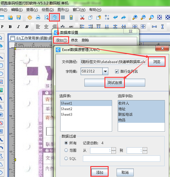 4.1點(diǎn)擊標(biāo)簽窗口上方的柱型按鈕,添加數(shù)據(jù)庫,選擇事先準(zhǔn)備好的excel表格(即收件方的信息),將表格導(dǎo)入到領(lǐng)跑標(biāo)簽打印軟件中,然后點(diǎn)擊“測(cè)試連接”按鈕,點(diǎn)擊“添加”即可。