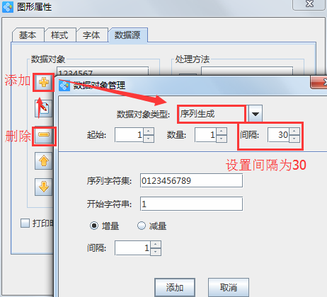 利用“繪制普通文本”工具在設(shè)置好的畫布上繪制一個文本框,雙擊文本框進入屬性窗口,在“數(shù)據(jù)源”選項中,刪除默認數(shù)據(jù)后,再添加一個新的數(shù)據(jù)對象,數(shù)據(jù)對象類型為“手動輸入”,輸入固定不變的數(shù)值,完成后點擊“添加”,接著再次添加一個新的數(shù)據(jù)對象,設(shè)置數(shù)據(jù)對象類型為“序列生成”,設(shè)置上方間隔為30(也就是每組標簽的開頭數(shù)值與下一組標簽開頭數(shù)值之間的間隔數(shù)),然后點擊添加。