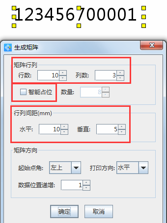 接著選擇上方菜單欄中的“生成矩陣”工具,在彈出的窗口中,取消“智能占位”,設(shè)置矩陣行列數(shù)為10行3列,并且設(shè)置行列間距,完成后點擊確定,就生成了一組有序的文本數(shù)值,再根據(jù)情況進一步調(diào)整間距。