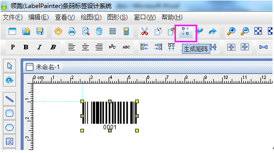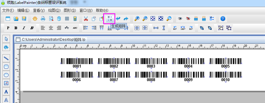 打開中瑯標(biāo)簽條碼打印軟件,在頂部橫向工具欄中,有個“矩陣生成”工具,就是我們要用的標(biāo)簽內(nèi)容的批量生成工具。以,一張紙上10個序列號排列的小條碼為例,是從0001-1000的編號。