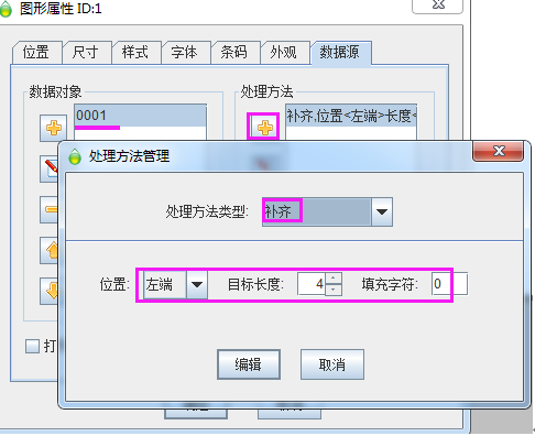 然后在,點右側(cè)的處理方法,為了保證數(shù)據(jù)位數(shù)是4位,添加一個“補齊”的處理方法。彈出的設(shè)置窗口中,依次輸入:從“左端”,數(shù)據(jù)長度“4”,填充“0”。完成操作。這樣就設(shè)置好一個序列號的條碼。